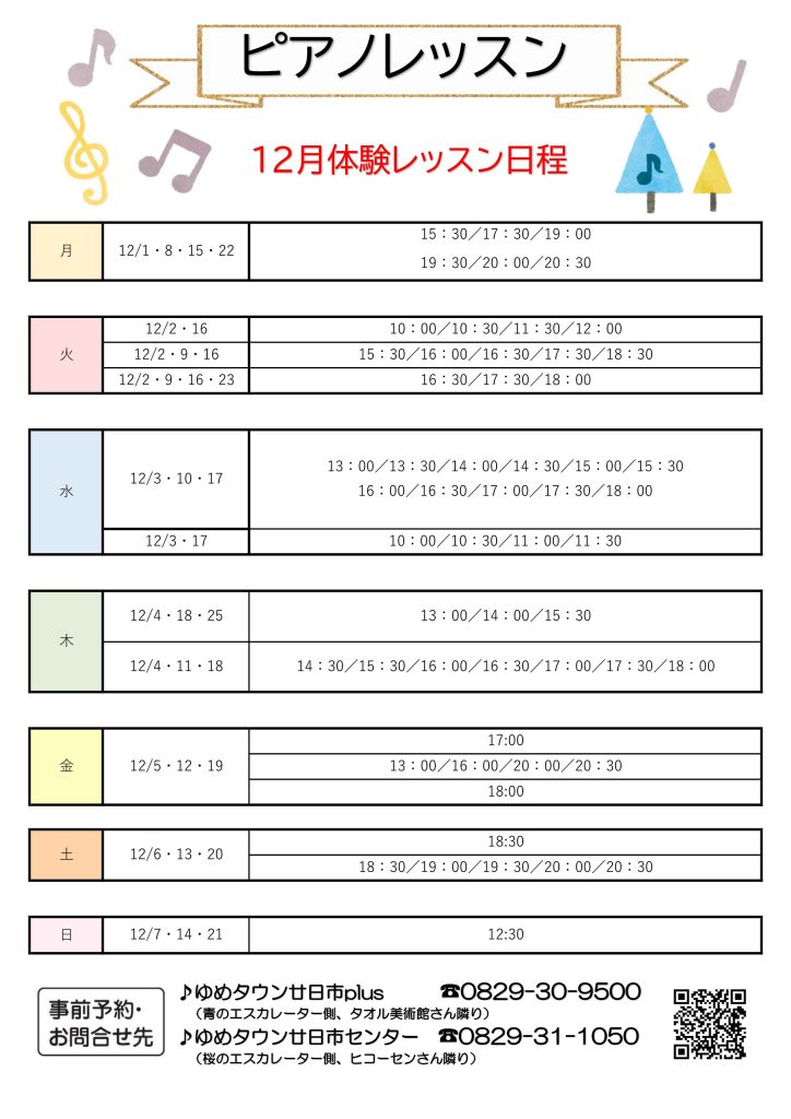 12月は下記の通り無料体験レッスン行います!